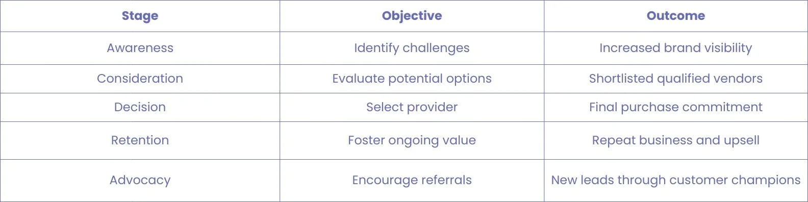 The goal at this stage isn’t to sell, but to help prospects clarify their needs and see you as a trusted resource. Done right, this sets the stage for the deeper evaluation that comes next in the consideration phase.